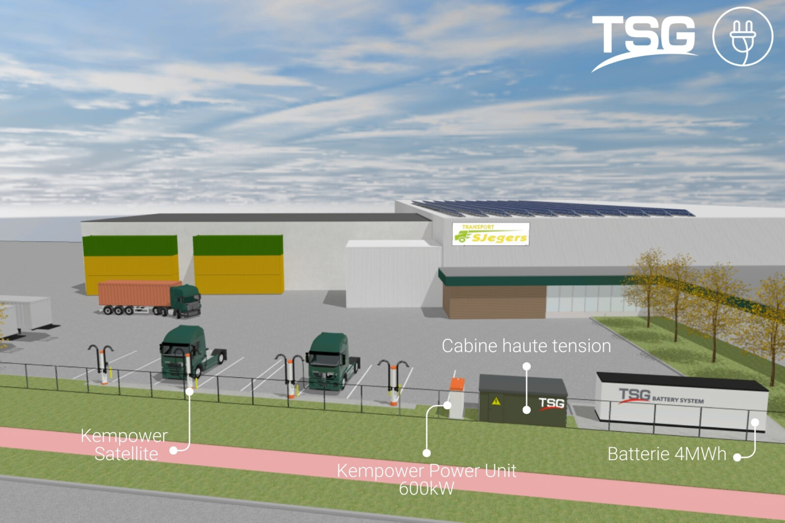 Le projet comprend plusieurs facettes, ce qui demande une approche bien analysée et réfléchie. TSG a guidé et soutenu Ward S’Jegers autant que possible pendant le projet. « L’électrification de la flotte ne se limite pas à l’achat de camions électriques et d’une infrastructure de recharge. Chaque élément s’accompagne de nouveaux défis », explique Ward. « Les coûts de l’énergie sont rapidement devenues un élément important. Pour la réduction de ces coûts, nous avons décidé de rénover le toit et de l’équiper des panneaux solaires. Puisque nous souhaitons recharger la nuit, TSG nous a proposé un système de stockage d’énergie qui nous permet de stocker l’énergie solaire pendant la journée et de recharger de manière durable la nuit. » Bientôt, les travaux de TSG commenceront pour concrétiser le projet. TSG se chargera des travaux électriques, des travaux civils, de la fourniture et de l’installation de 4 systèmes de recharge doubles Satellite de Kempower, d’une Kempower Power Unit de 600kW, d’une cabine haute tension et d’une batterie pour le stockage de l’énergie. La société de transport S’Jegers pourra compter sur le service de TSG, également après la réalisation.