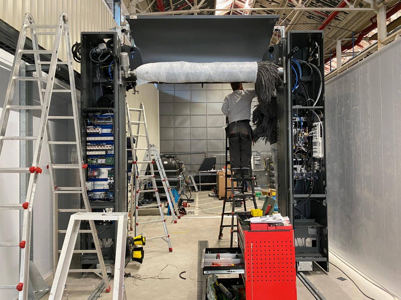 In de hal zijn diverse extra zaken geplaatst zoals de hogedrukreiniger voor manuele voorwas (met handige zwaaiarm) en de compressor + slanghaspel. Voor de roll-over is gekozen voor de Kärcher CWB-3, welke vakkundig door onze monteurs is geplaatst.