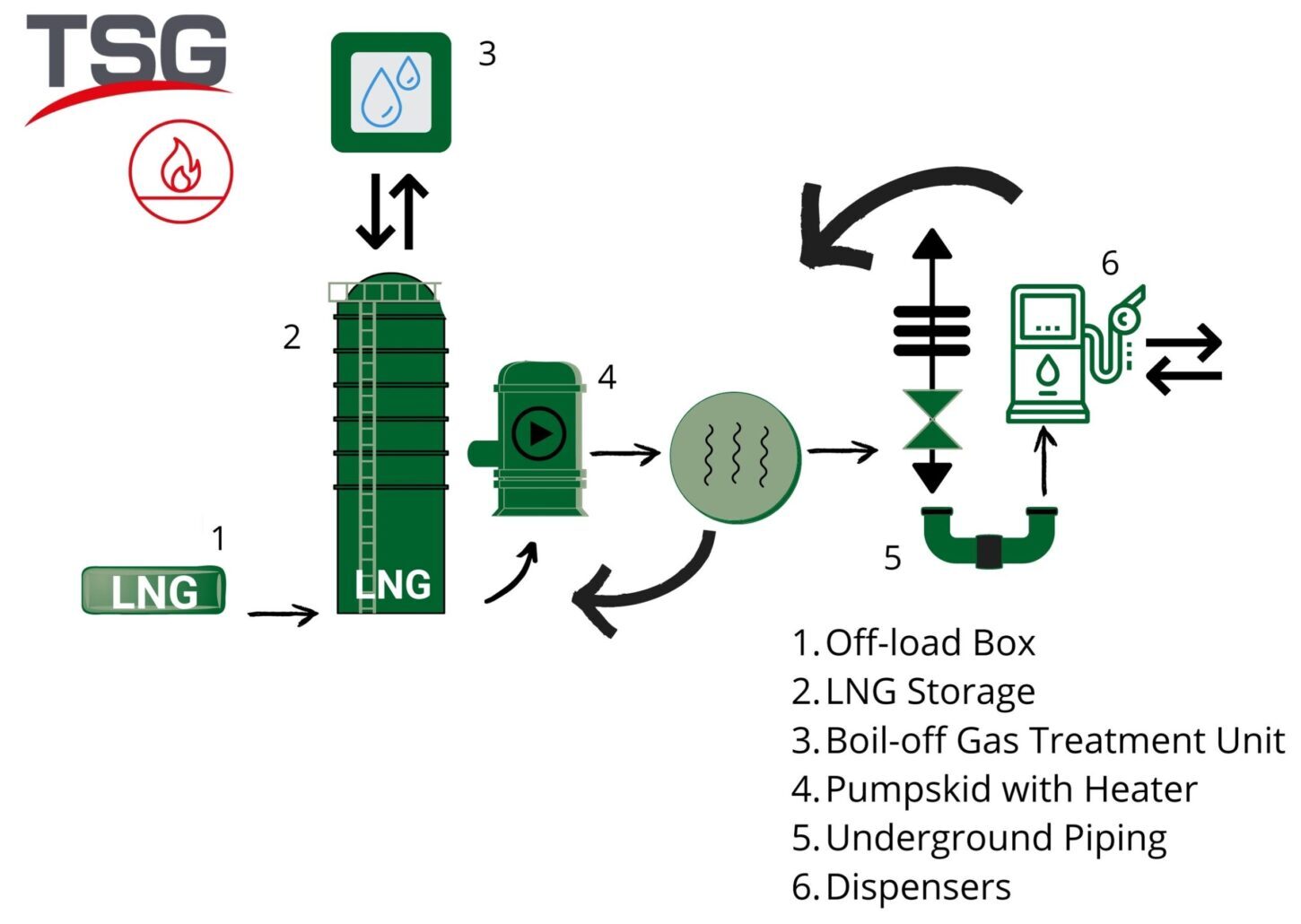 De installatie van LNG vraagt om speciale aandacht. TSG levert deze installaties voor openbare stations, particuliere of bedrijven met o.a. vrachtwagens, bussen, treinen en schepen.