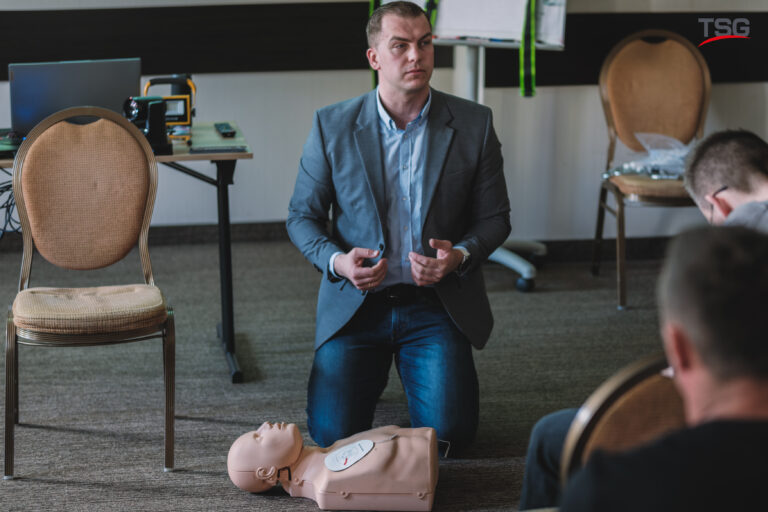 W części praktycznej uczestnicy wzięli udział w szkoleniu z obsługi AED, poznając procedury ratujące życie w sytuacjach kryzysowych.